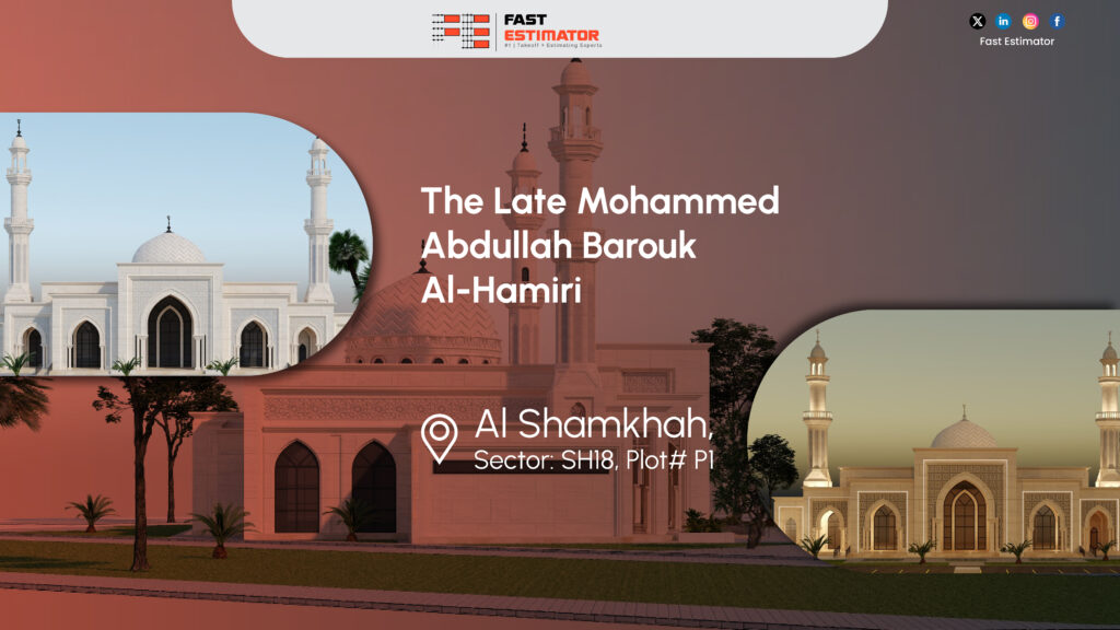 At Fast Estimator, we take pride in contributing to projects that hold deep cultural, architectural, and community significance. One such remarkable project is the mosque dedicated to The Late Mohammed Abdullah Barouk Al-Hamiri, located in Al Shamkhah, Sector SH18, Plot #P1.