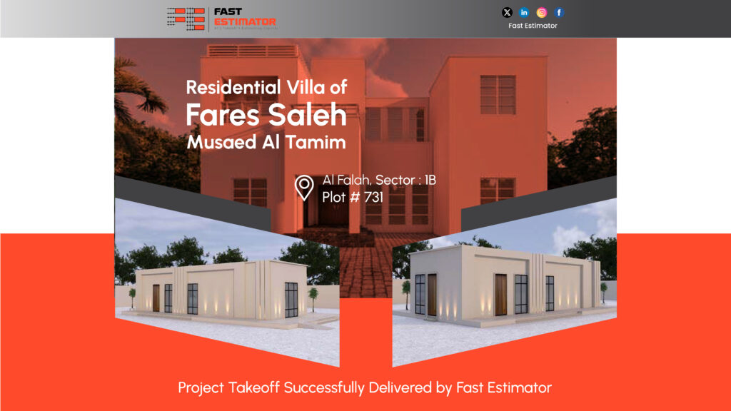 Fast Estimator has proudly delivered the project takeoff for the stunning residential villa of Fares Saleh and Musaed Al Tamim, located in Al Falah, Sector 1B. The project, situated on Plot #731, features a modern design and is a testament to exceptional architectural execution and project management. This successful delivery underscores Fast Estimator’s commitment to quality and precision in the construction industry.