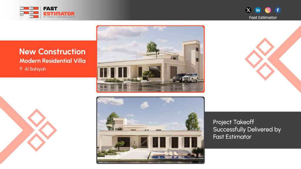 Fast Estimator, proudly presents the successful completion of a project takeoff for a modern residential villa in Al Bahiyah. This project highlights our commitment to accuracy, efficiency, and professional estimating services that support smooth construction workflows from start to finish.