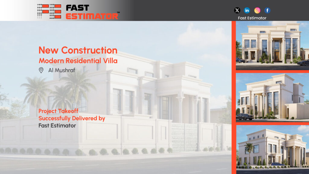The New Construction Modern Residential Villa in Al Mushraf highlights the essential role of professional estimation in achieving project success. Through accurate quantity takeoff and strategic cost planning, Fast Estimator supported efficient budgeting and seamless project execution.