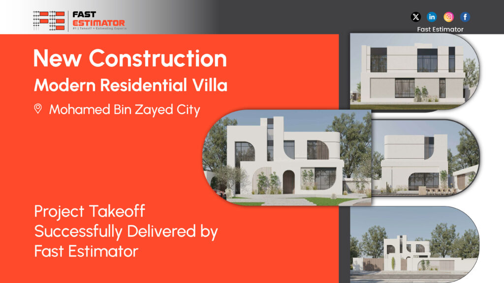 Fast Estimator is proud to showcase the successful project takeoff delivery for a new construction modern residential villa in Mohamed Bin Zayed City. This project reflects a perfect balance between contemporary architectural design and precise construction estimating, ensuring a smooth and cost-effective execution from concept to construction readiness.