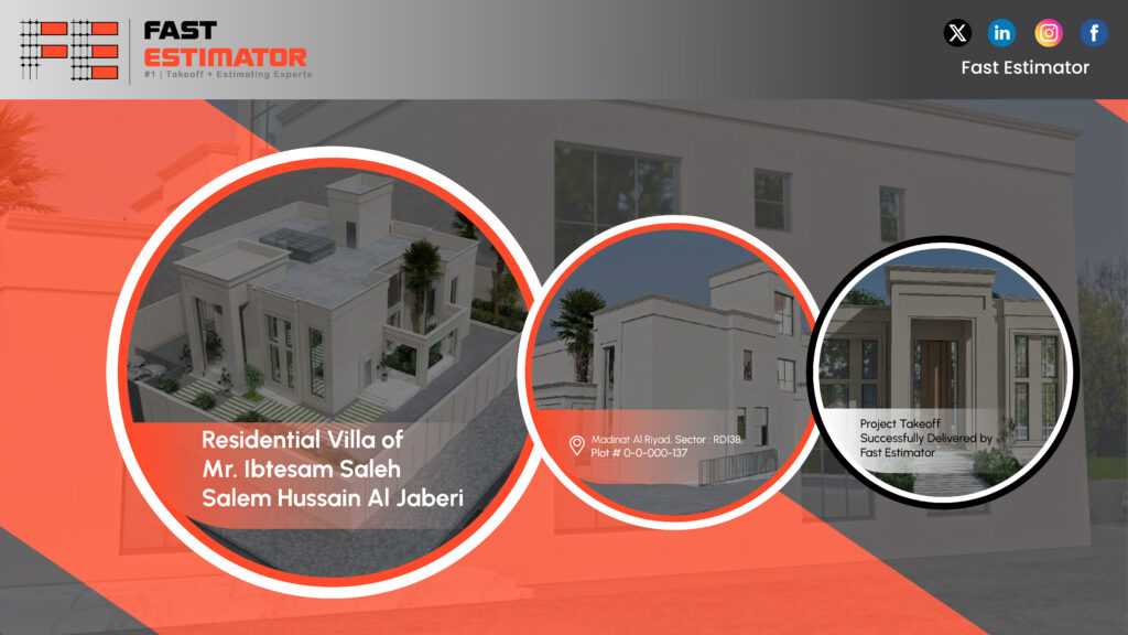 We are pleased to share another successful milestone from Fast Estimator, continuing our commitment to supporting developers, consultants, and contractors with precise and reliable project takeoff solutions. Our latest project features a luxury residential villa designed for Mr. Ibtesam Saleh Salem Hussain Al Jaberi in Madinat Al Riyad, located at Sector RD138, Plot # 0-0-000-137.