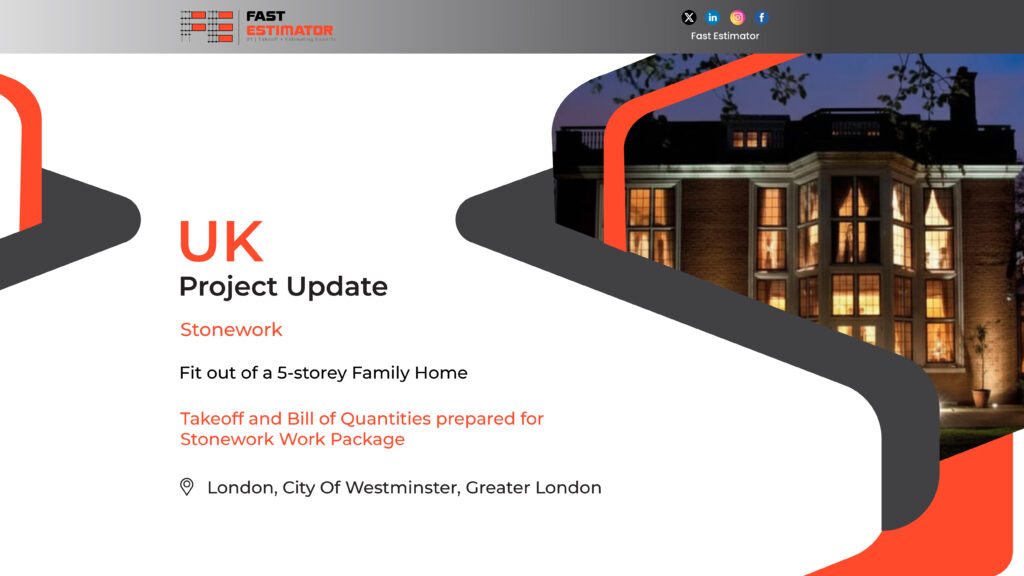 Accurate quantity takeoffs are the foundation of successful construction projects—especially when working with specialist trades such as stonework. Fast Estimator is pleased to share a UK project update involving the preparation of a detailed stonework takeoff and Bill of Quantities (BOQ) for the fit-out of a 5-storey family home located in Westminster, Greater London.